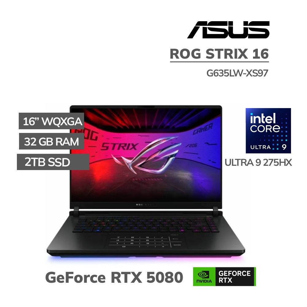 Laptop Gamer Asus Rog Strix 16 Intel Core Ultra 9 275Hx 32Gb Ram 2Tb Ssd 16” Wqxga T. Video Nvidia Rtx 5080 16Gb Windows 11 (G635Lw-Xs97)